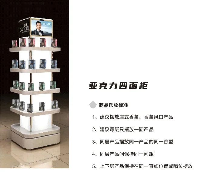 香百年的產品主要有香水座、香膏、風口、掛飾幾大類,為了方便客戶根據個人需求快速挑選產品,因此建議門店分類陳列,或把相關聯的兩類產品陳列在一起,做到大類分明、有條有理,從而取得更好的陳列效果。同時,產品陳列一旦確定,則不要輕易更改。
