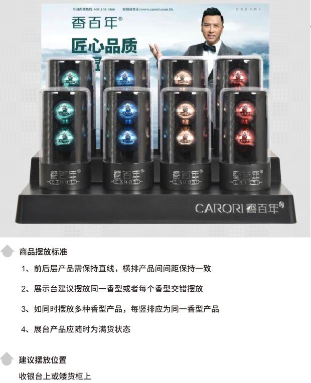 香百年車載香薰體積相對偏小,單個產品很難吸引消費者注意,而展架產品保持滿貨狀態,在視覺呈現上會更加顯眼、美觀,而且更能激發客戶的購物興趣和熱情,因此需要及時補充展架上產品,把每一個展架都擺滿產品,充分發揮展架的倉庫儲蓄作用,杜絕空柜。